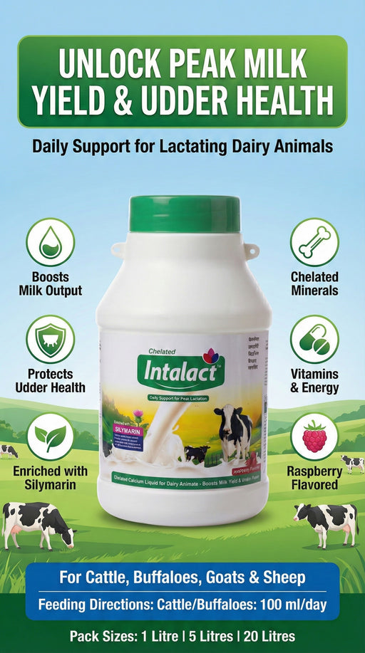 View full detailsIntalact UHF – Chelated Calcium Supplement for Dairy Animals | Boosts Milk Yield, Udder Health & Reproductive Wellness | Raspberry Flavor | Cows, Buffaloes, Goats & Sheep